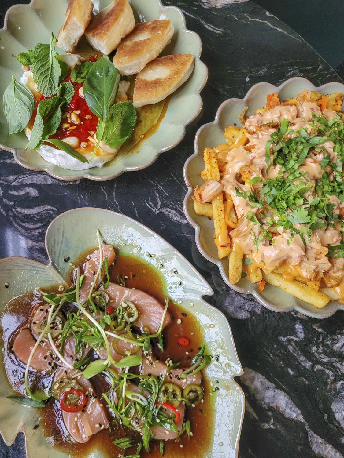 Ja keittiöhän onnistui! Hunajalla ja fermentoidulla chilillä höystetty vaahdotettu ricotta on koukuttavan hyvää, ja lohisashimin liemi vei kielen mennessään.