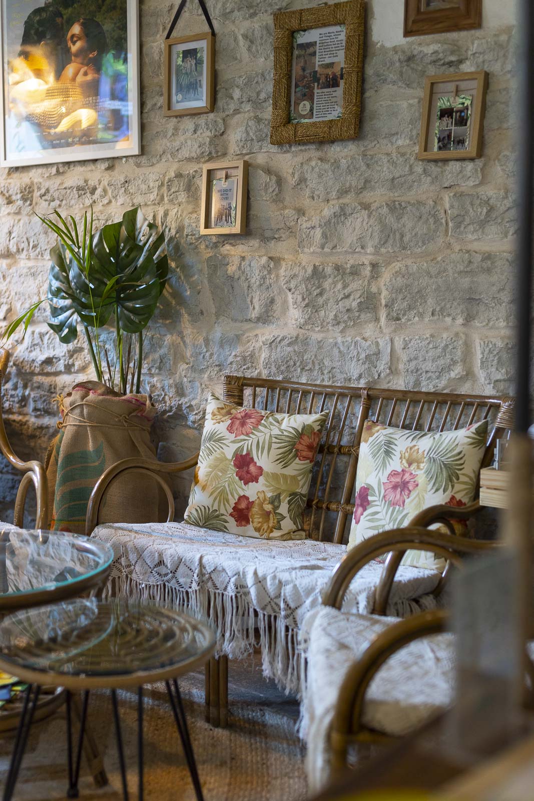 Cafe Brasil todella on kellarissa, sillä sinne laskeudutaan aika monta porrasta katutasosta. Mutta mikä tunnelma tänne onkaan luotu: korilamppuja, kutsuvia pöytäryhmiä, valonauhoja, rouhealla kiviseinällä brasilian lippu… ja veikkaan, että keskellä tilaa oleva kasvi olla kahvipuu!