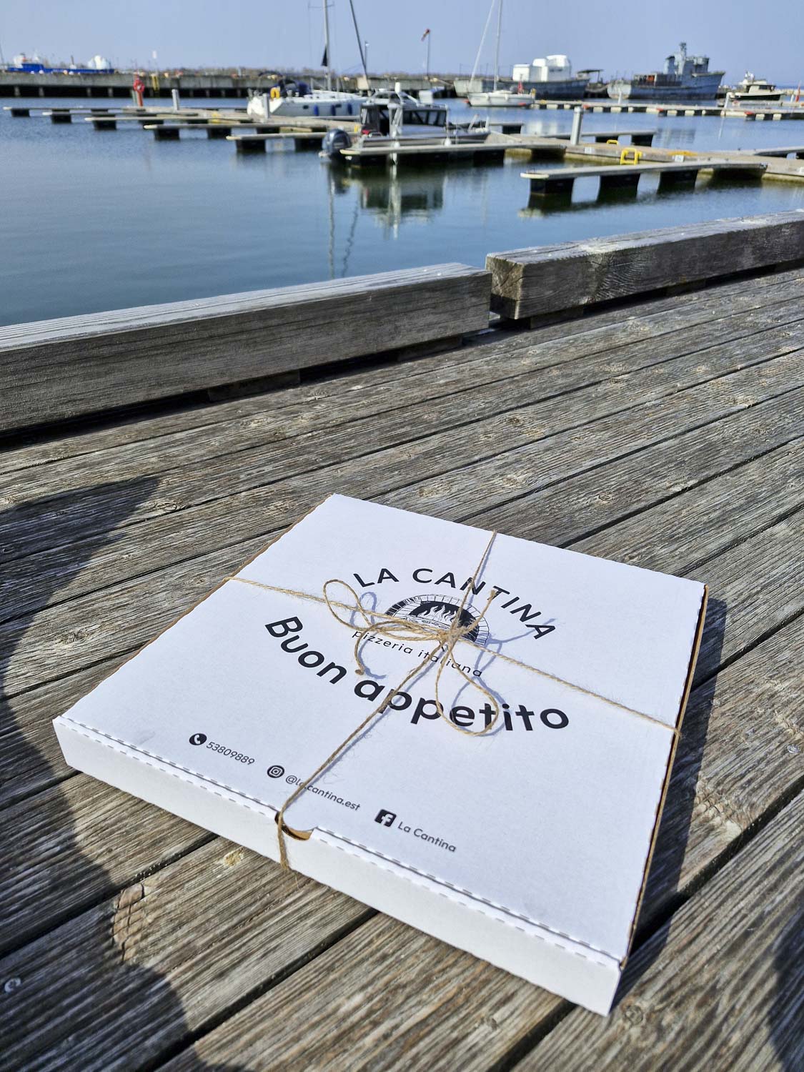 Tilasin pizzan mukaan ja etsin täydellisen paikan ruokailulle: rantalaituri. Auringossa lämmennyt puu, meren tuoksu ja lämmin pizza – täydellinen yhdistelmä!