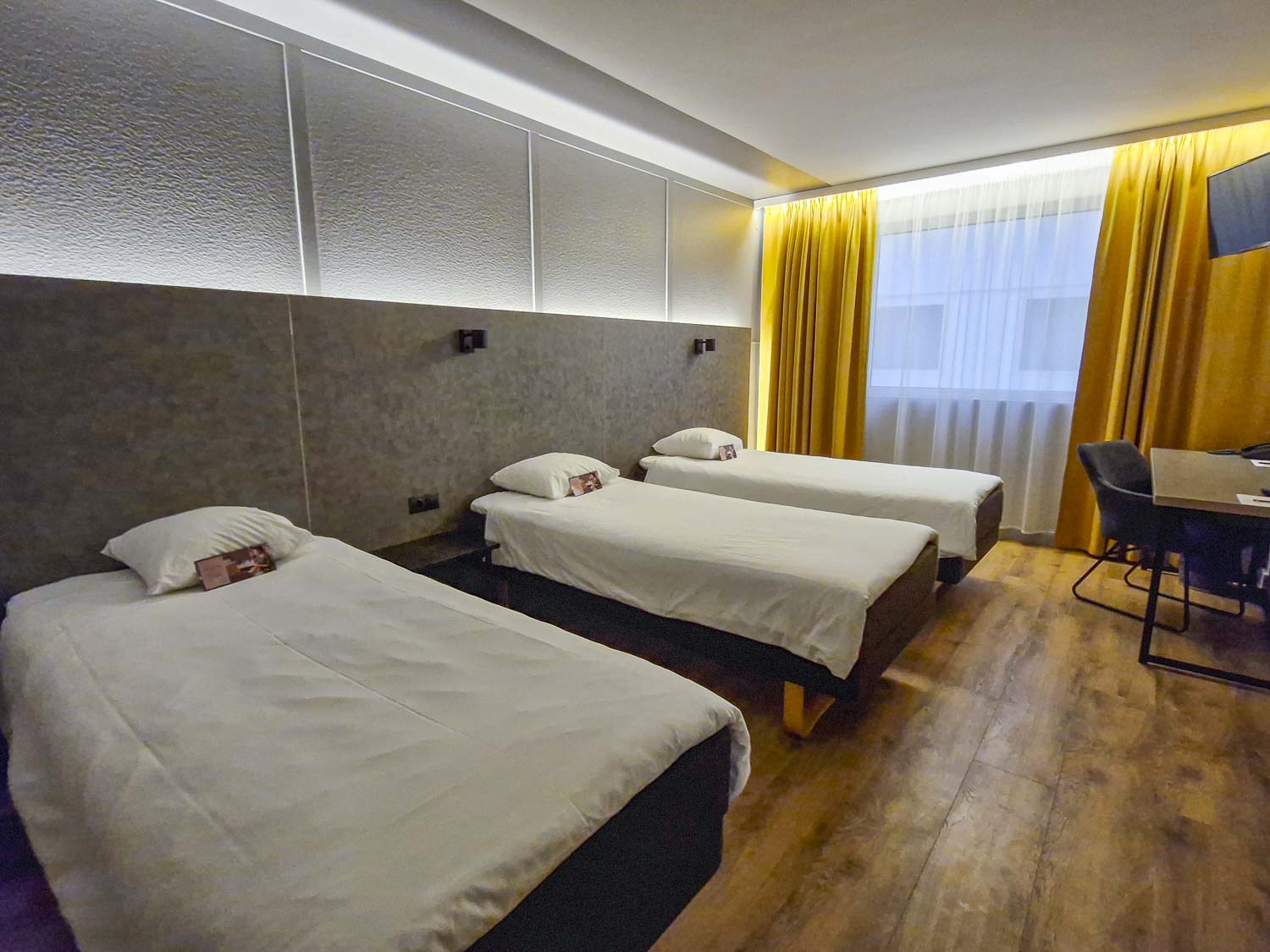 Huoneet ovat spa-puolta vaatimattomampia, mutta niissä on hyviä puolia: kaikissa on parkettilattia, toisin kuin kylpylähotellin kokolattiamattoisissa huoneissa.