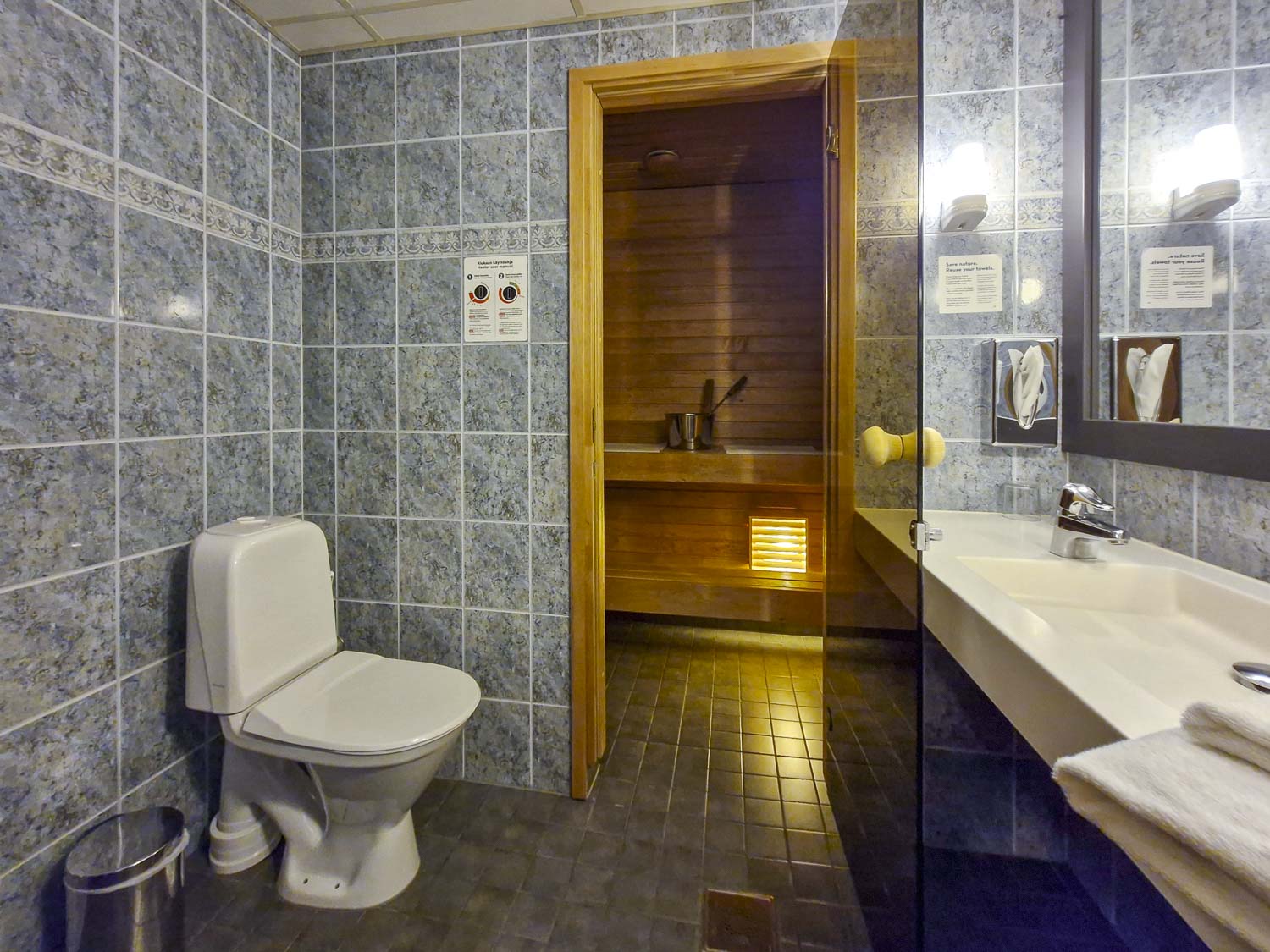 Kurkataan myös perushotellin huoneisiin. Niihin ei kuulu kylpylän käyttö, mutta sen saa lisämaksusta – samoin kylpytakin voi vuokrata erikseen.