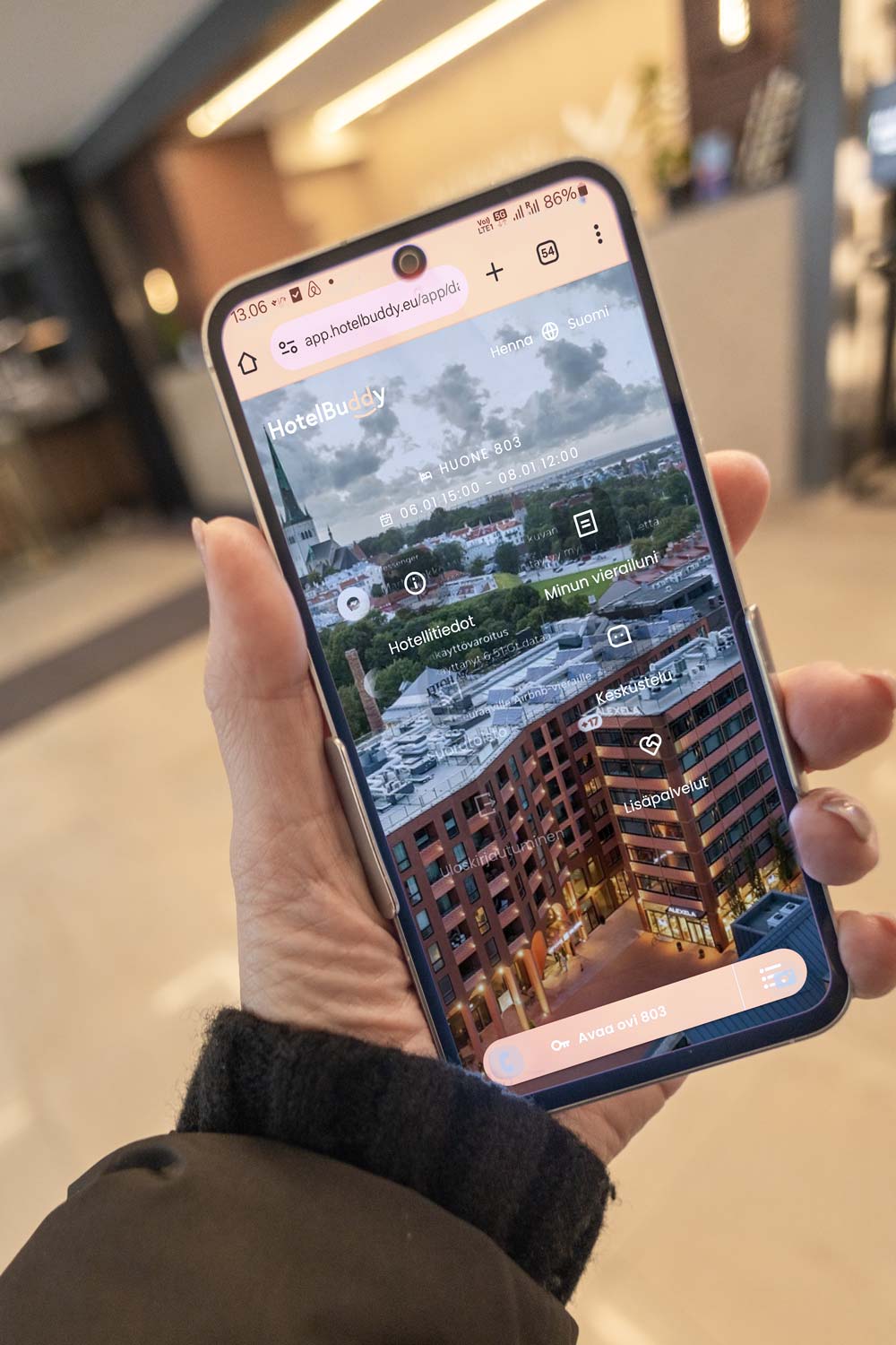 Sisäänkirjautumisen voi hoitaa joko perinteisesti respassa tai kätevästi etukäteen verkossa. Hotellilla on käytössään HotelBuddy-palvelu, jota halusin itsekin kokeilla – ja se toimi mainiosti.