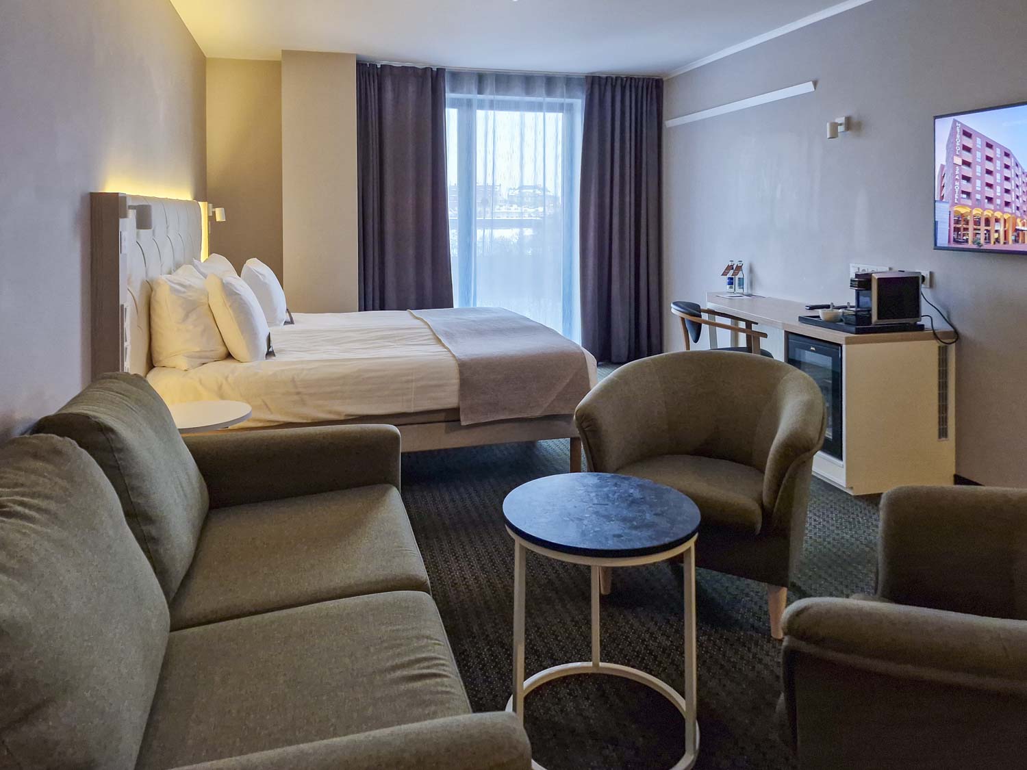 Kylpylähotellin puolella kaikissa huoneissa on kylpytakki. Huoneiden hintaan kuuluu myös kylpyläosaston ja kuntosalin käyttö. Wifi on automaattisesti käytössä kaikissa huoneissa, ja jokaiseen mahtuu myös vauvasänky, jos sellaista toivoo.