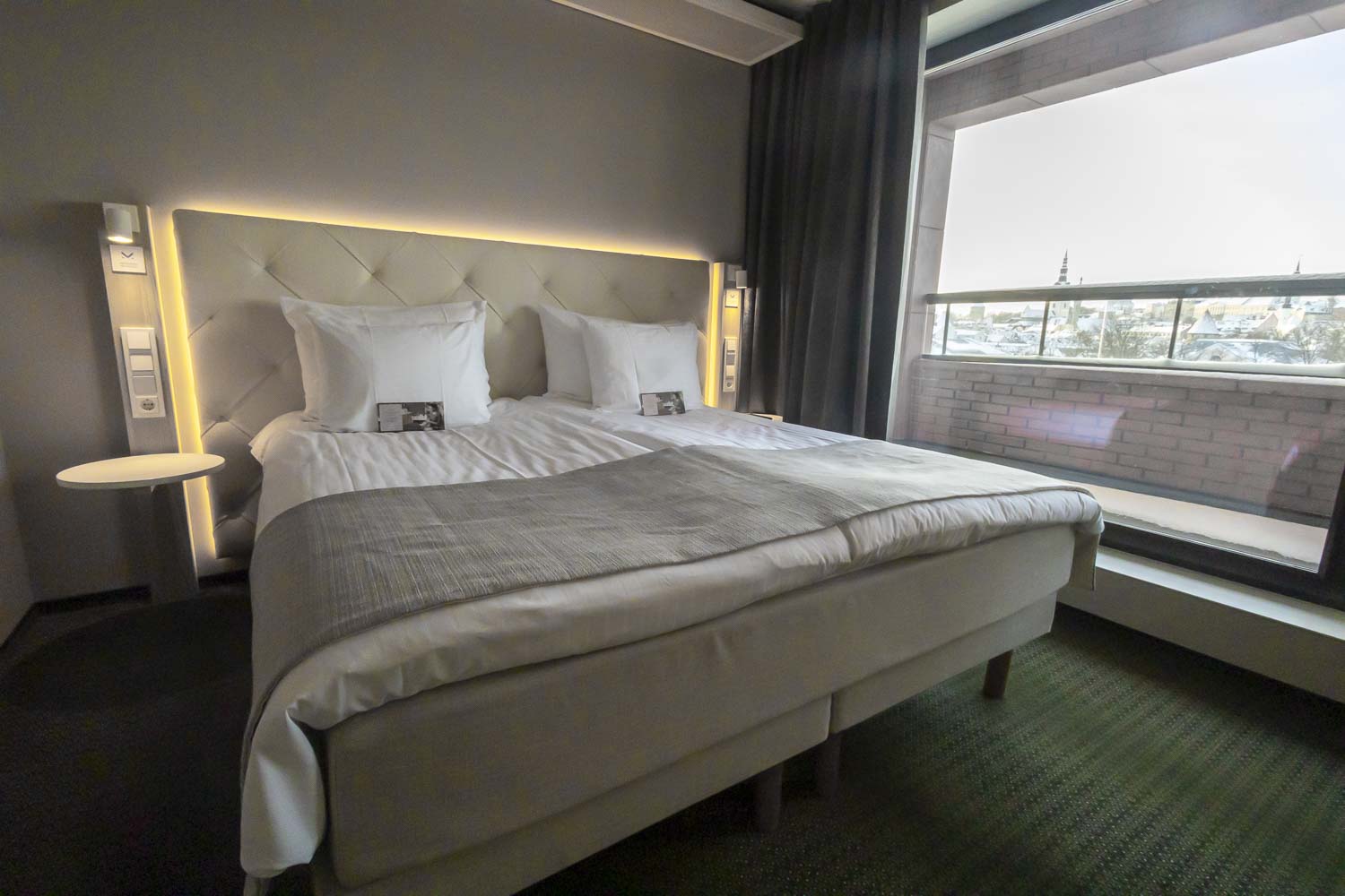 Ylemmistä kerroksista löytyy vähän hintavampia huoneita. Superior-huoneista aukeaa upeat näkymät, ja deluxissa on jopa parveke Rotermannin suuntaan.