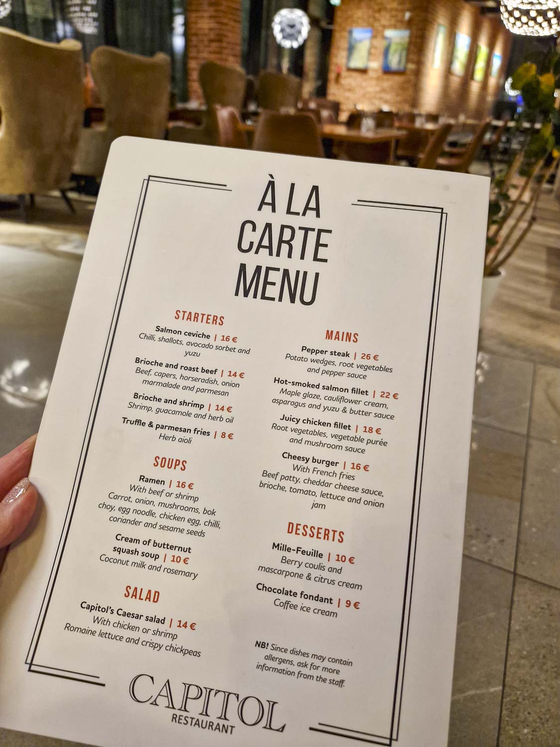 Sinun ei tarvitse astua jalallasi ulos jos ei huvita: Spa-hotellin alakerrassa on ravintola Capitol. Sen listalla on pippuripihvistä alkaen syötävää suomalaismatkailijoiden makuun, ja sekä ruuat että juomat ovat kohtuudella hinnoiteltuja.