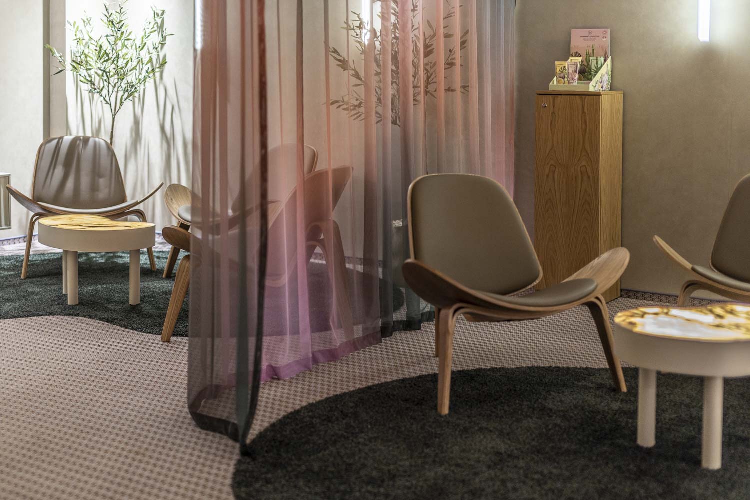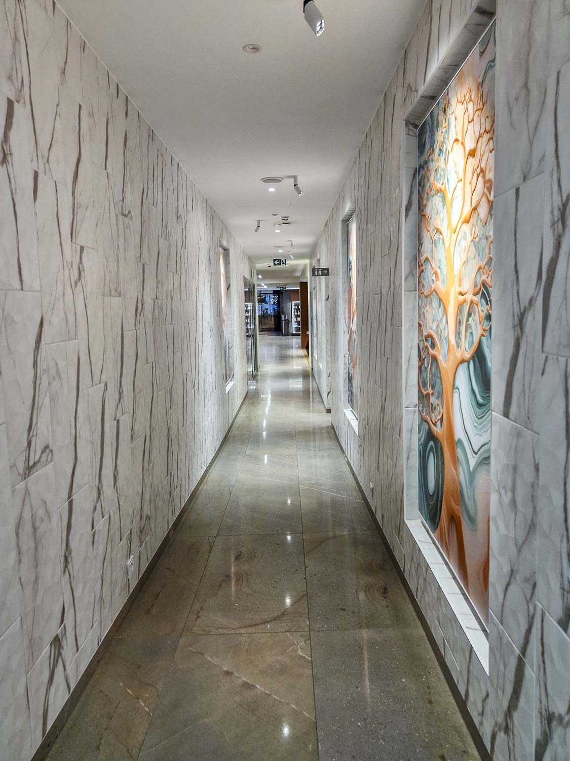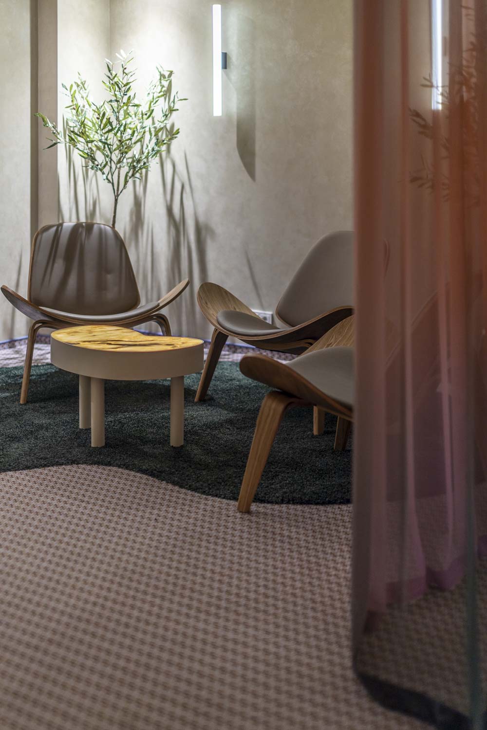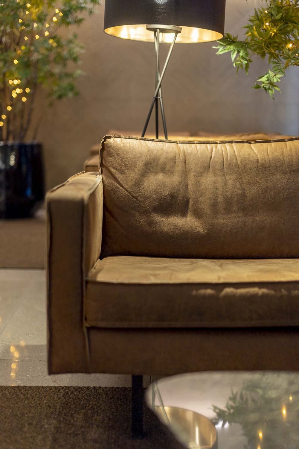Aulassa on monta viihtyisää sohvaryhmää, ja valaistus on luotu erityisen hyvällä maulla.