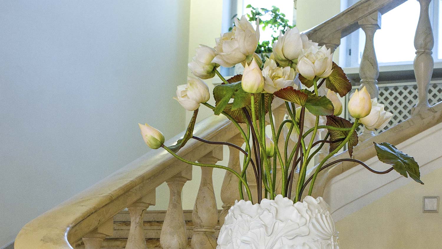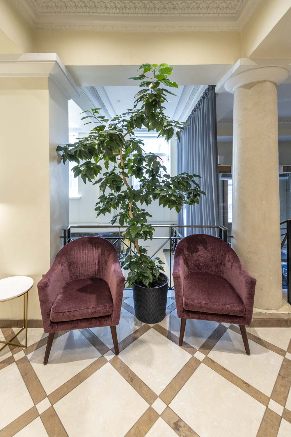 Sisääntuloaulaan noustaan juhlavan näköistä portaikkoa pitkin, vastaanoton löydät portaiden yläpäästä etuvasemmalta.