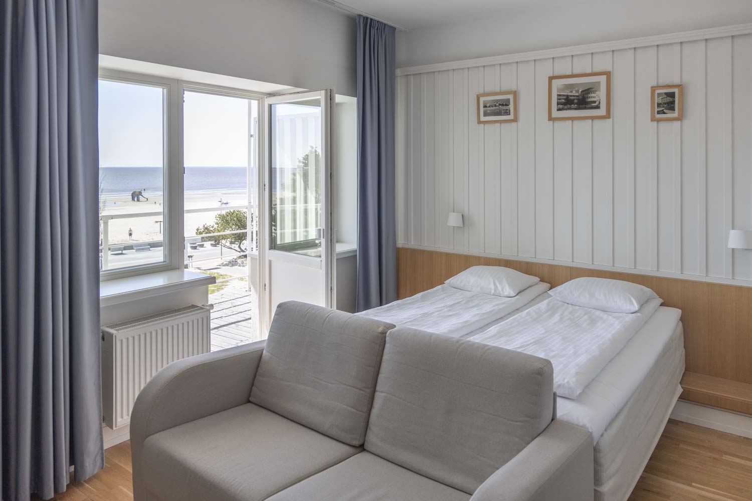 Meri: tämä hotelli todellakin on rannalla. Omassa huoneessani oli parveke, josta avautui huikeat näkymät Pärnun upealle hiekkarannalle ja merelle.
