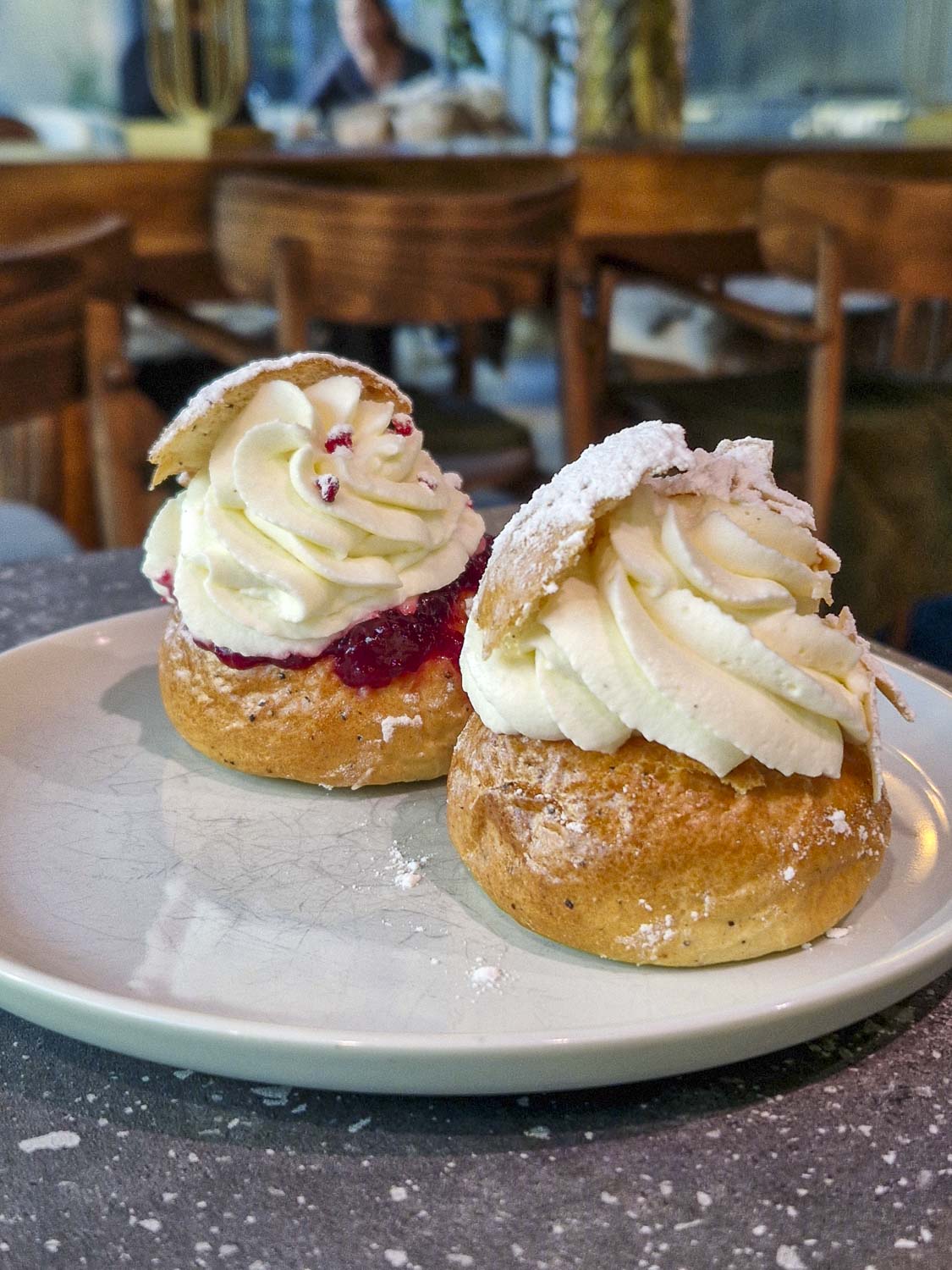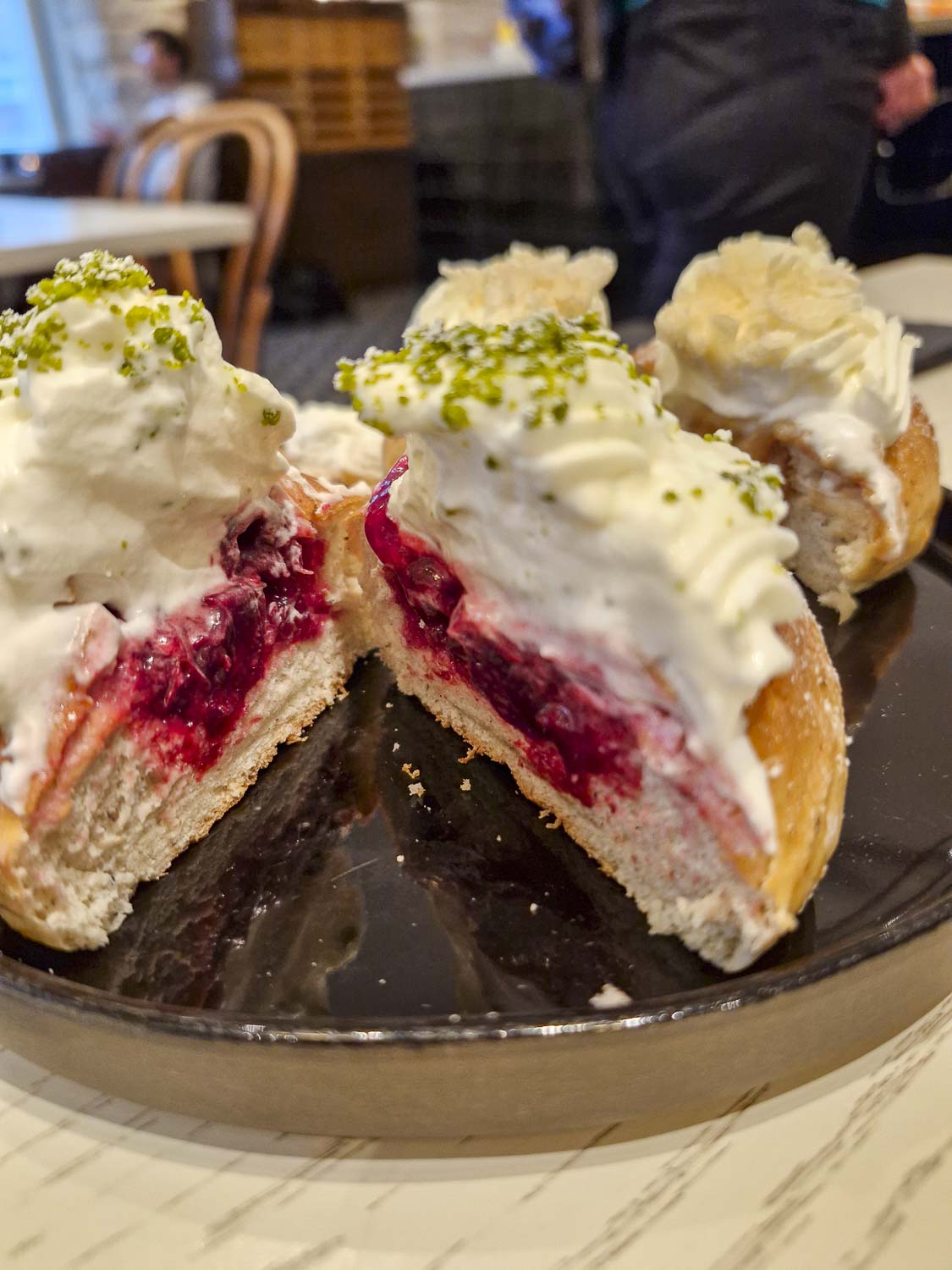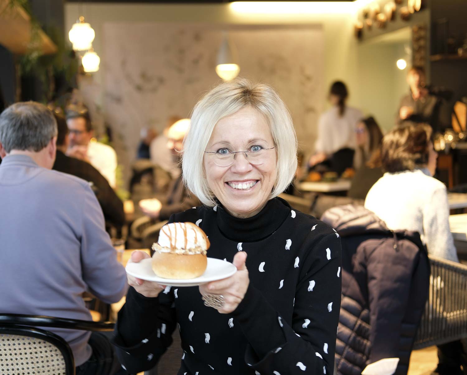 Perinteisen mansikkahillon lisäksi tai sijaan täällä pääsee maistamaan laskiaispullia esimerkiksi kirsikalla, puolukalla, raparperimansikalla, karhunvatukalla tai jopa mangolla.